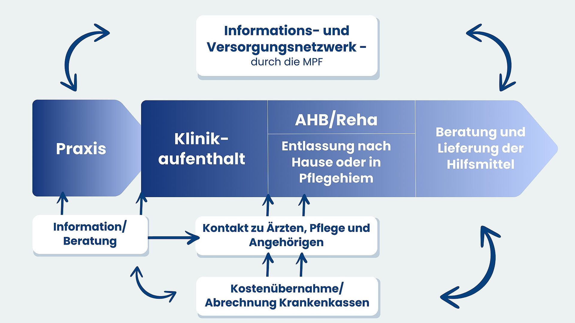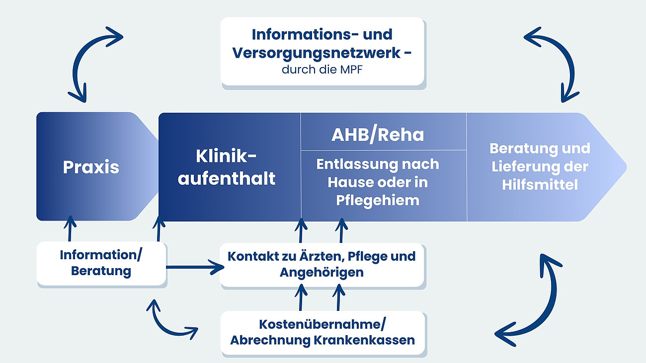 Auf Wunsch der Betroffenen übernimmt die MPF nach der Entlassung aus dem Krankenhaus direkt die Kommunikation mit der Arztpraxis. Zudem organisiert sie die Folgeversorgung mit Hilfsmitteln und die Kostenübernahmeanträge bei den Krankenkassen. Die Ersteinweisung in den Gebrauch der Hilfsmittel erspart den Betroffenen einen Besuch in der Arztpraxis. Besonders im Bereich der ableitenden Inkontinenz ist diese Unterstützung wichtig.