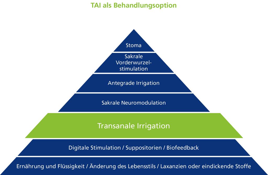 Unabhängig von den jeweiligen Problemen beim Stuhlgang gibt es mittlerweile zahlreiche Möglichkeiten zur Behandlung. Je nach Ursache - versteht sich! Eine Funktionsstörung im Darm lässt sich behandeln, sodass Symptome deutlich reduziert oder sie vollständig behoben sind. Wie diese Behandlung aussieht? Dafür gibt es viele gut gemeinte Ratschläge, aber kommen wir zu den Fakten. Studien zeigen eine Behandlungspyramide für die Behandlung von Darmfunktionsstörungen. Aktuelle Studien1 verdeutlichen, dass TAI (transanale Irrigation) als Behandlungsmöglichkeit einen hohen Stellenwert einnimmt. Mehr zur Darmentleerungsstörung, der entsprechenden Behandlungspyramide und TAI als Therapieform, das erfahren Sie hier.