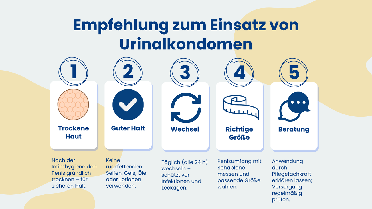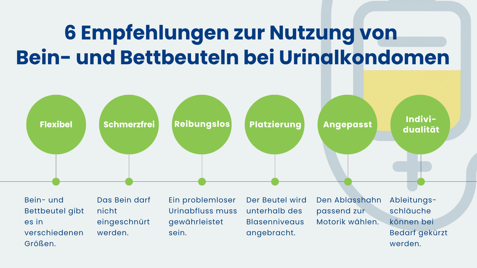 Es gibt allgemeingültige Empfehlungen für die Verwendung eines Urinalkondoms in Verbindung mit einem Urinbeutel (Beinbeutel oder Bettbeutel).